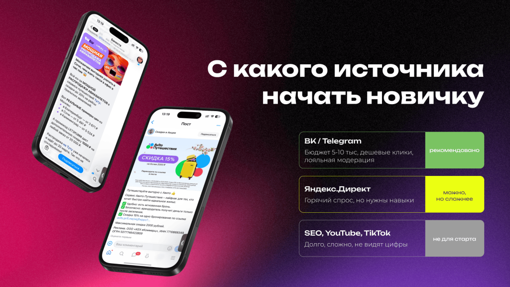 Пуши и тизерные сети можно попробовать, но это скорее, когда ты уже понимаешь, что делаешь. Там дёшево, но качество трафика часто ниже, конверсия может быть очень слабой.