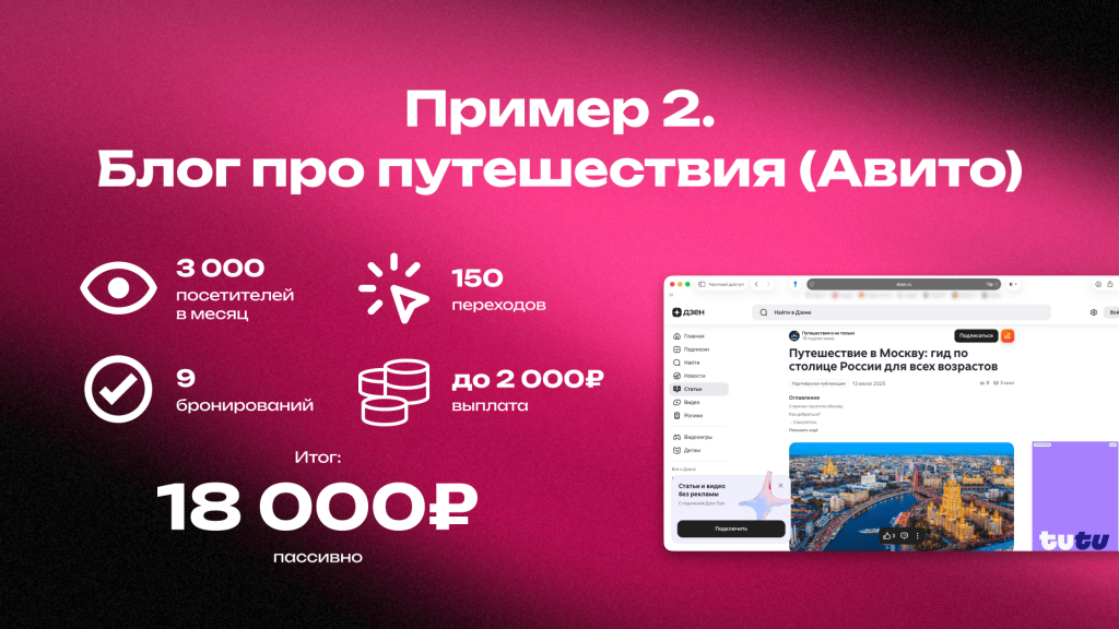 У тебя информационный блог про самостоятельные путешествия по России. ✅Написал статью «Как снять квартиру посуточно и не попасть на мошенников». Внутри даешь обзор сервисов бронирования, в том числе Авито Путешествия, и вставляешь партнерскую ссылку. 🔥Статья вышла в топ поиска и приносит 3000 посетителей в месяц.